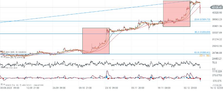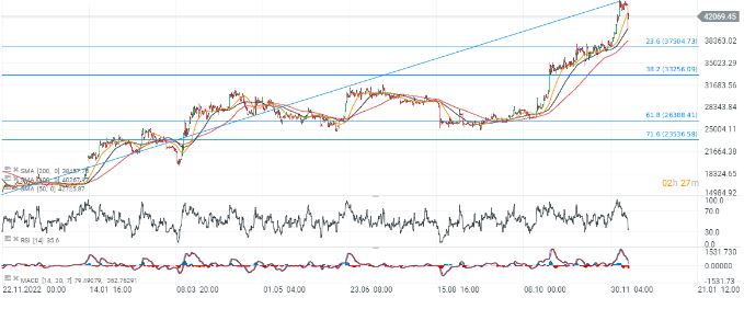 La mayor de las criptomonedas cotiza hoy con una caída de alrededor del 4%, aunque en su punto máximo estaba cerca del 8%. Si observamos el MACD, una corrección tan dinámica sólo puede ser comparable a las caídas de principios de septiembre, cuando Bitcoin cayó de 27.500 dólares a alrededor de 24.000 dólares. Si se mantuviera la estructura alcista, otro escenario parece ser una consolidación en torno a los 40.000 dólares.