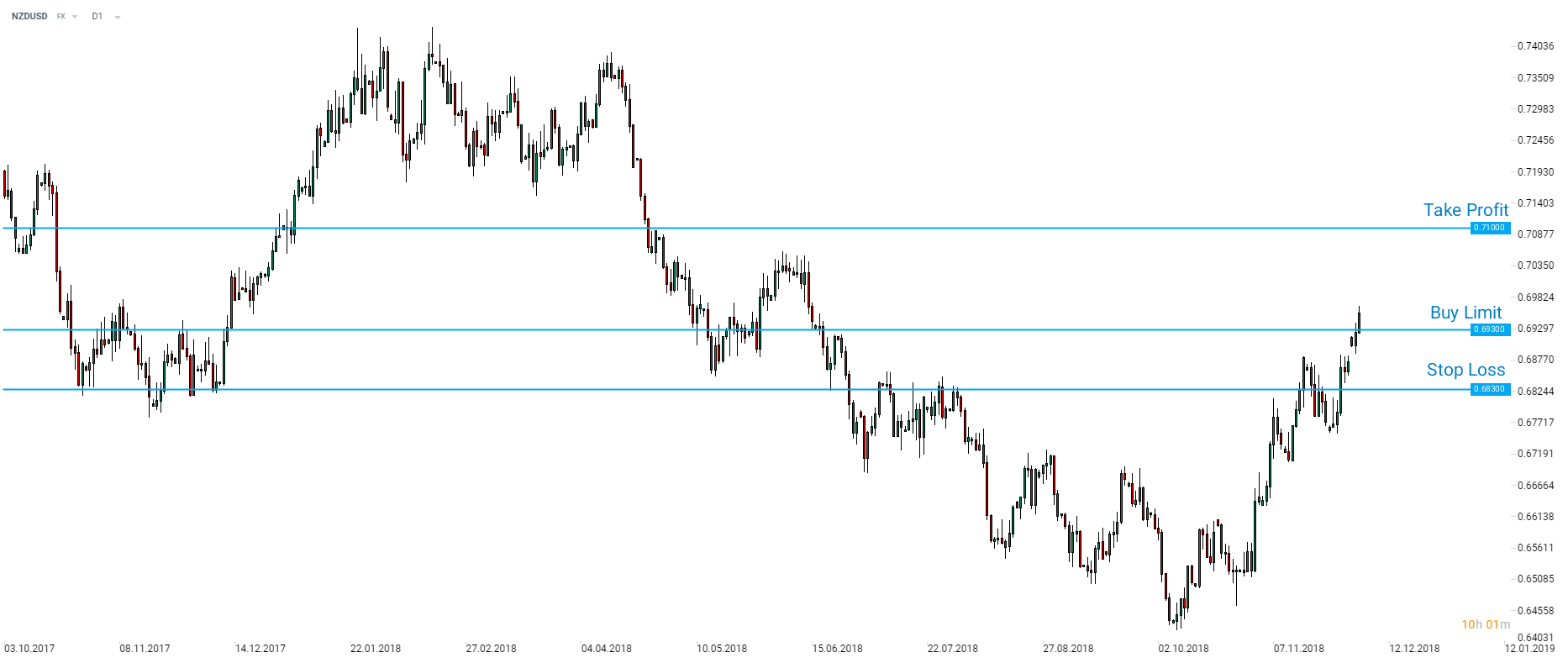 UOB recomienda tomar una posición pendiente larga en NZDUSD con una orden límite en 0.6930, un objetivo de 0.7100 y un aorden de stop loss en 0.6830. Fuente: xStation5