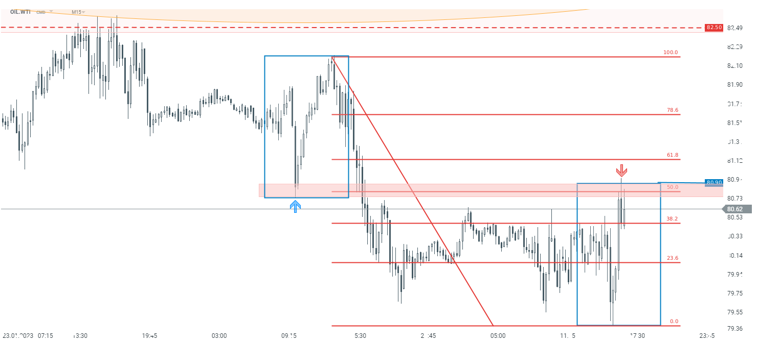 Poco después de la publicación de los datos de inventarios de petróleo de EE. UU., el precio del crudo subió (mencionamos esto en nuestra publicación anterior). Sin embargo, al observar OIL.WTI en el marco de tiempo M15, el movimiento alcista se estancó alrededor de la resistencia intraday clave en $ 80.90, que está marcada con el límite superior de la estructura local 1: 1, el retroceso de Fibonacci del 50% y el máximo local anterior. Mientras el precio se mantenga por debajo, se puede lanzar otro impulso a la baja. Por otro lado, si se produce una posible ruptura alcista, podría allanar el camino hacia los últimos máximos de $82,5.