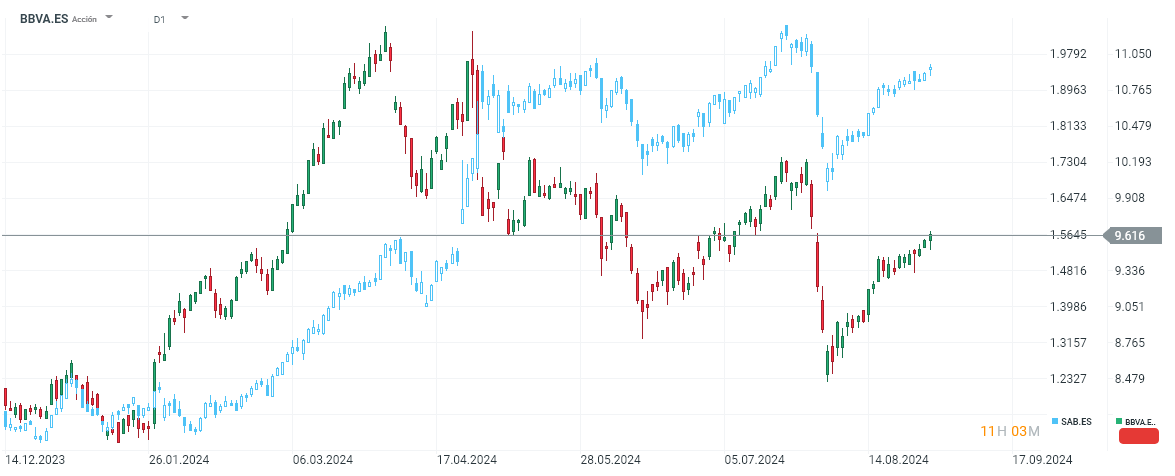 La evolución del precio de las acciones de BBVA (velas verdes y rojas) y Sabadell (velas blancas y azules) ha sido dispar. Las acciones de BBVA han caído algo más de un 6% mientras que las de Sabadell han subido un 8%. Esto es algo completamente normal en un proceso de adquisición, en el que el comprador baja en bolsa (debido a las posibles dificultades de integrar el nuevo negocio) y la adquirida sube.