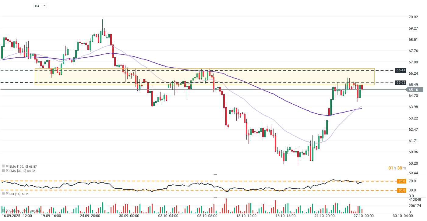 Los futuros del crudo Brent (petróleo) vuelven a rebotar desde la resistencia en torno a los 65,50 dólares por barril, tras informes de prensa que indican que la OPEP+ planea un nuevo —aunque modesto— aumento de producción en su próxima reunión del domingo 2 de noviembre.
