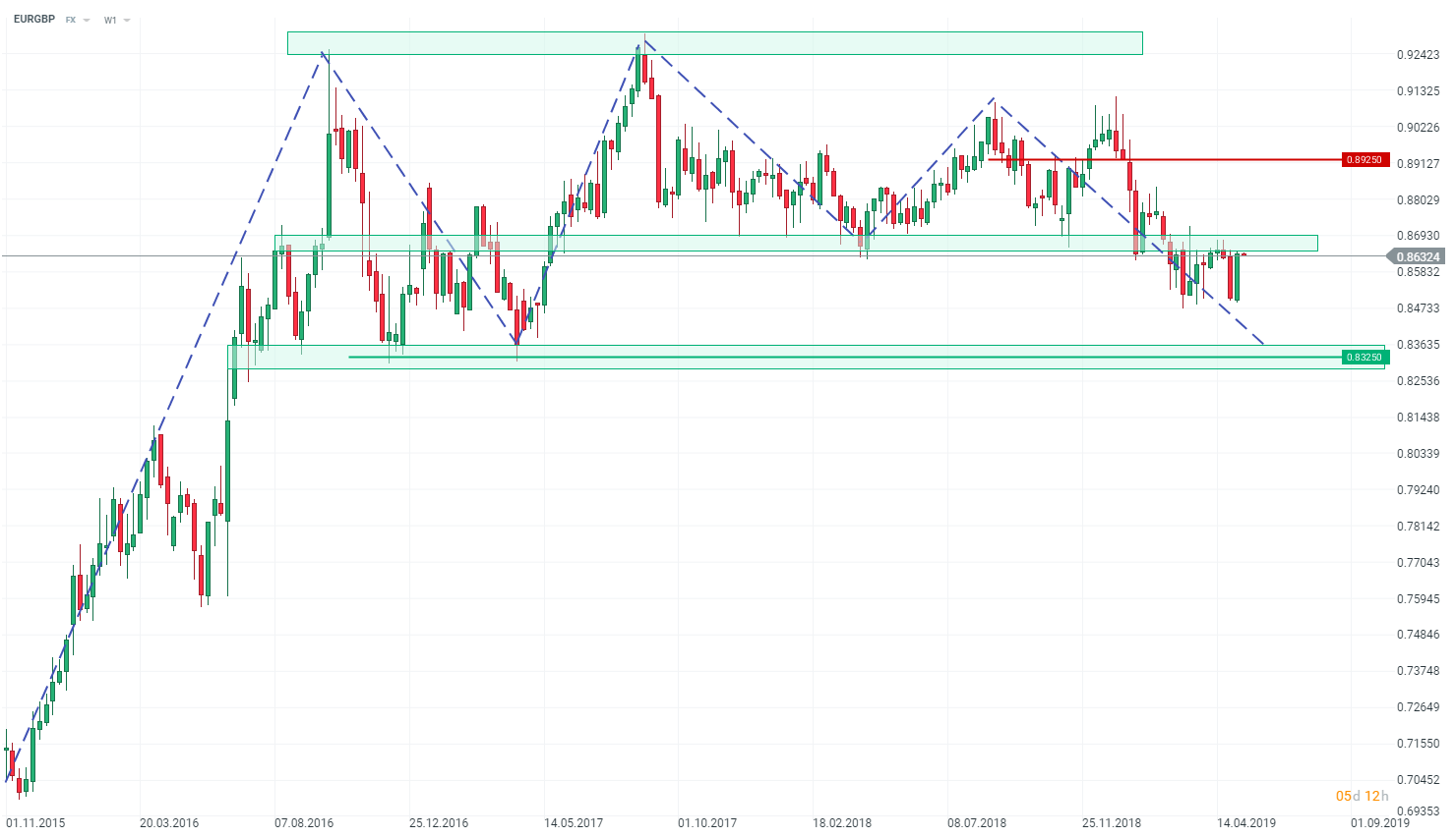 Justificación: Aunque el EURUSD se movió al alza la semana pasada, el cruce GBPUSD giró hacia abajo, lo que lleva a un gran movimiento al alza en el EURGBP. ¿Eso está justificado? La incertidumbre del Brexit está a punto de persistir, pero cuando nos fijamos en la economía y aún más en la dirección de la política monetaria, se está haciendo evidente que el Reino Unido está relativamente mejor que la UEM. Eso debería apoyar una dirección descendente en el par y eventualmente conducirlo al límite inferior de la consolidación 2016.