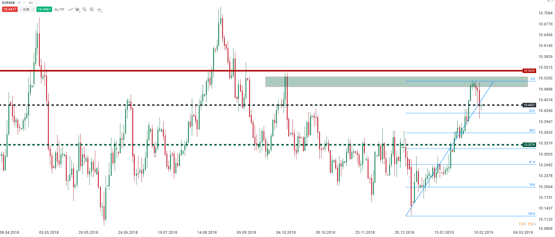 JUSTIFICACIÓN: Ayer, Riksbank confirmó a los mercados otra subida de tipos en la segunda mitad de 2019. Además, el banco central espera la apreciación de la corona y ve que la desaceleración económica es visible principalmente en la Zona Euro. Al mismo tiempo, el personal de economía del BCE presenta nuevos pronósticos en marzo y la junta de política en realidad habla de alternativas y la reducción de sus proyecciones debería ser un escenario básico. Puede causar una presión adicional sobre el euro junto con el empeoramiento de los datos económicos. En el gráfico, el par EURSEK no logra romper la resistencia en las cercanías de 10.52.