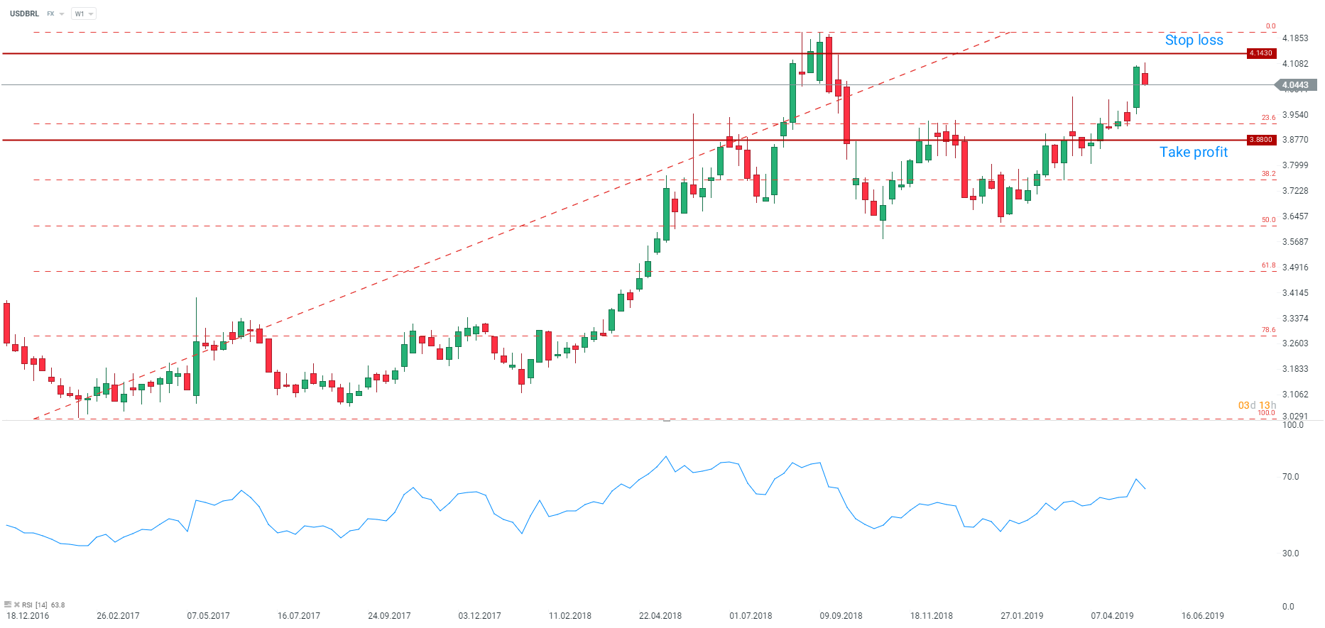 La postura de la economía brasileña es bastante mixta en medio de una política desordenada y un progreso lento relacionado con la agenda de reforma fiscal en el Congreso. A pesar de eso, la situación económica es mucho mejor que en otros países emergentes, como Turquía o Argentina. Creemos que la venta masiva de la moneda brasileña fue exagerada. Además, el BCB anunció la subasta de 3 mil millones de dólares el lunes, martes y miércoles. A pesar de las expectativas de los especuladores, llevó a la apreciación de la moneda local. En nuestra opinión, es un comienzo de la corrección a la baja en la tendencia alcista de mediano plazo. También creemos que las actas del FOMC pueden respaldar al dólar solo temporalmente y existe la posibilidad de obtener ganancias luego de un gran repunte en el par y en general en el dólar.