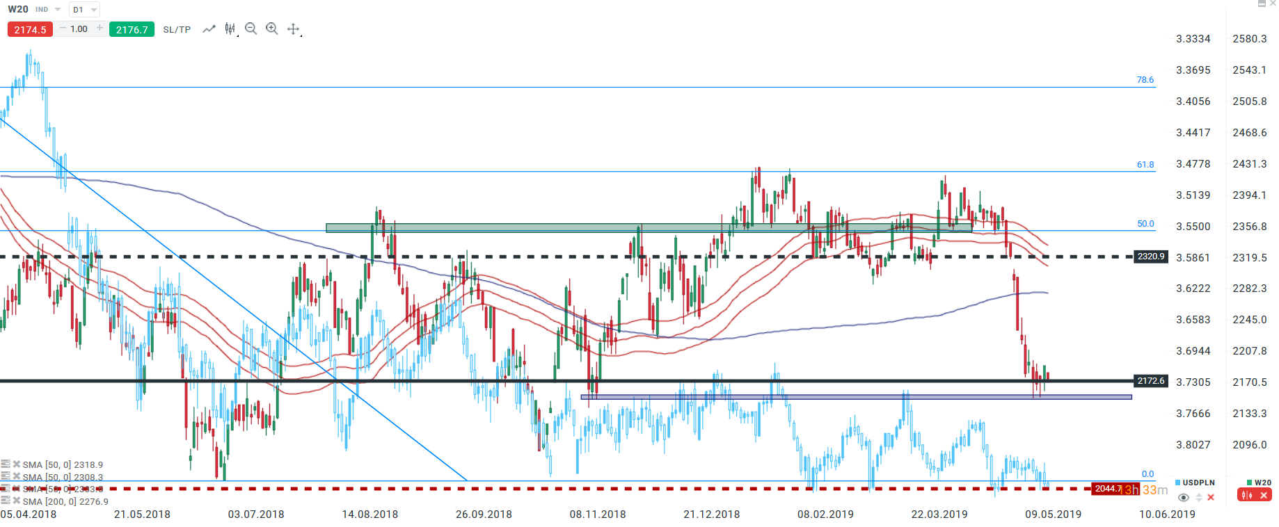 El W20 retrocede a la zona de soporte en la vecindad de 2150 puntos. Si la situación en los mercados globales se calma, el mercado de valores polaco puede ser uno de los beneficiarios de esta situación, porque la última caída parece estar exagerada. Además, el par USDPLN está en un nivel muy atractivo para los inversores extranjeros, lo que les brinda oportunidades para aumentar sus ganancias, ya que la última depreciación del zloty polaco podría ser demasiado excesiva y el movimiento fue causado principalmente por factores externos en los últimos días.