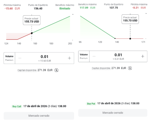 Esto te permite posicionarte según el escenario que consideres más probable: si crees que Oracle podría verse favorecida por nuevos contratos, expansión de centros de datos o mejoras en resultados, una call ofrece exposición a ese entorno. Si, por el contrario, anticipas correcciones por tensiones energéticas, retrasos en proyectos o volatilidad del sector tecnológico, una put permite capturar ese movimiento. En ambos casos, el riesgo máximo queda limitado a la prima pagada.