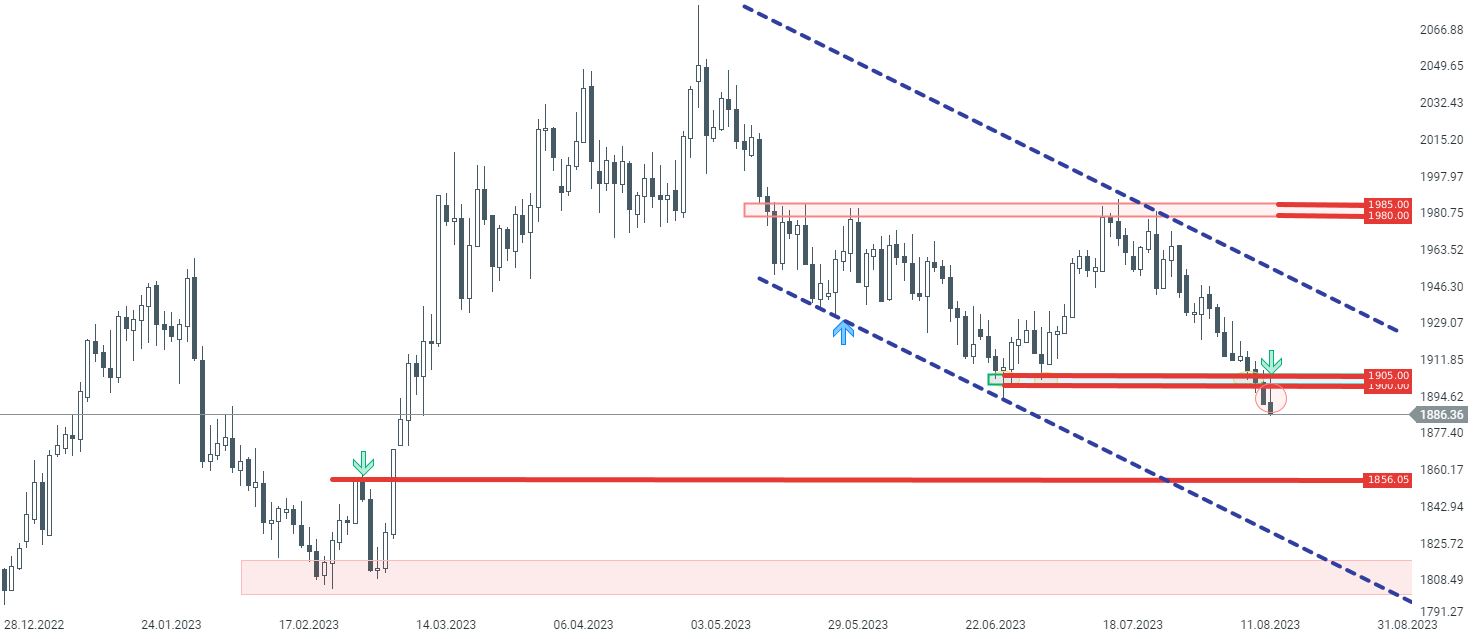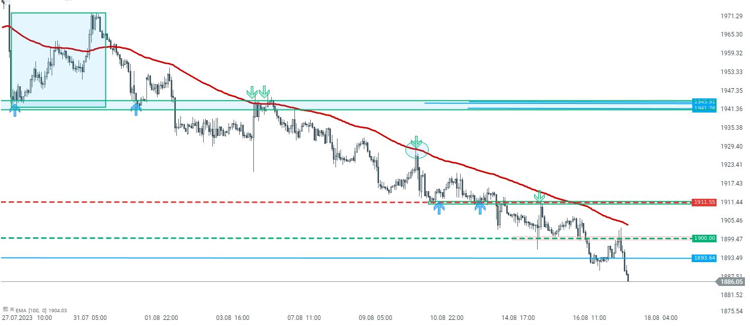 Durante la sesión de hoy podemos observar fuertes caídas en el mercado del oro, lo cual se debe al fortalecimiento del dólar estadounidense, respaldado por sólidas solicitudes y las actas de la Fed de ayer. Las cotizaciones del ORO rompieron por debajo de la zona clave de soporte de 1905-1900 dólares ayer y hoy no lograron regresar por encima, lo que resultó en una profundización del descuento. Según las suposiciones del análisis técnico clásico, mientras el precio esté por debajo de la zona mencionada, son posibles más ventas. El soporte importante más cercano se encuentra en 1856 dólares.
