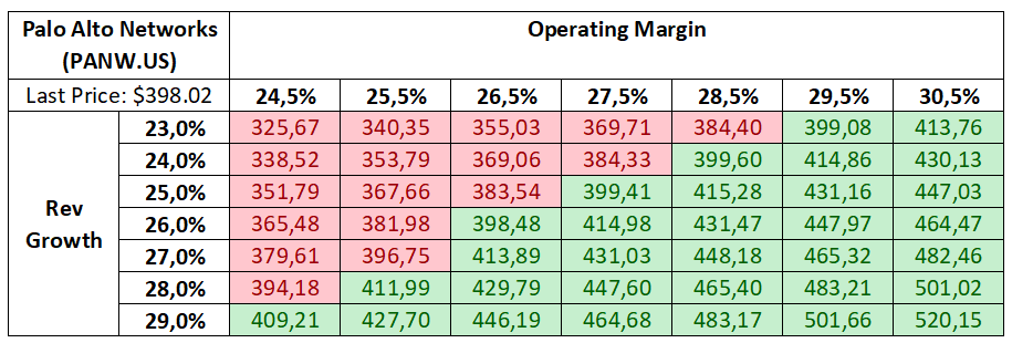 Bajo estos supuestos, nuestro modelo sugiere un valor intrínseco para las acciones de Palo Alto de 414,98 dólares por título, lo que indica un alza del 4,3% con respecto al precio actual de la acción. Es importante destacar la alta sensibilidad de los valores intrínsecos derivados del flujo de efectivo descontado a los supuestos de entrada. A continuación, dos matrices de sensibilidad ilustran diferentes escenarios de margen operativo y crecimiento de los ingresos, así como variaciones del WACC terminal y del crecimiento de los ingresos terminales.