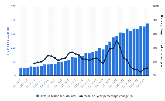 El valor de los pagos procesados por PayPal (TPV) registró niveles récord en el segundo trimestre de 2023, acercándose a los $400 mil millones, pero el mercado considera más importante la dinámica de este crecimiento. Este estuvo disminuyendo año a año desde 2021 hasta el cuarto trimestre de 2022; ahora estamos viendo un repunte nuevamente. Los 'mínimos' ahora pueden respaldar un posible efecto base 'favorable' en los trimestres siguientes, pero vale la pena señalar que PayPal está empezando a verse un poco abrumado por la escala: es difícil esperar que la dinámica de $400 mil millones en pagos procesados esté en alguna parte cerca de eso cuando era dos o tres veces menos. El mercado rebajó la valoración: vio el riesgo de que PayPal se convirtiera en una empresa 'estancada', no en un negocio de 'crecimiento'. Fuente: Statista