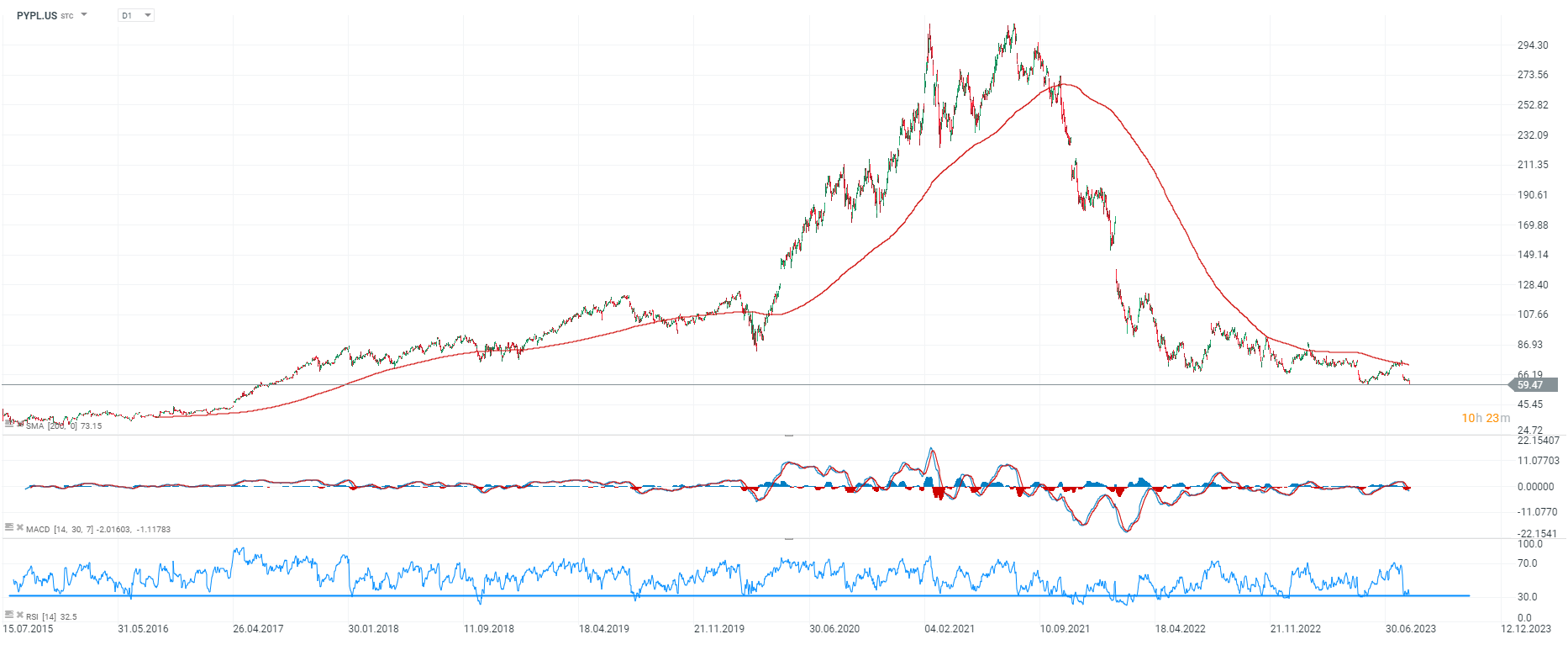 Acciones de PayPal (PYPL.US). El promedio de SMA200 en el intervalo D1 es consistentemente un nivel de resistencia clave para los alcistas y actualmente se encuentra en $73 por acción. Fuente: xStation5