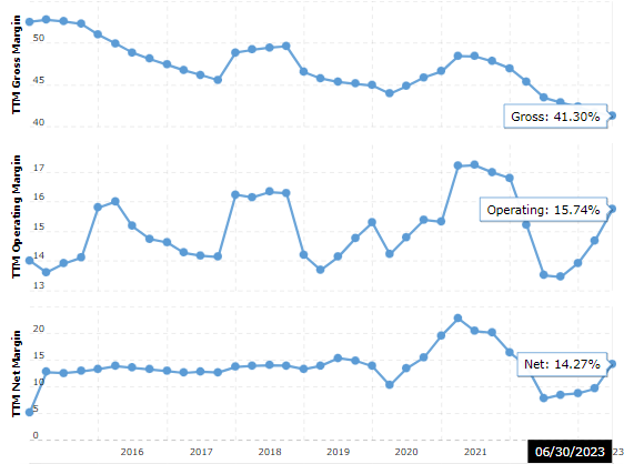 Los ingresos de la compañía, aunque registraron una desaceleración en el crecimiento interanual (sin catalizadores significativos), registraron un récord en el segundo trimestre, aumentando de $12 mil millones a $28,5 mil millones o casi el 150 % desde 2017. Sin embargo, se observa cierto estancamiento trimestralmente. Al mismo tiempo, no se aprecia un crecimiento interanual negativo, lo que podría justificar las reticencias con las que el mercado trata a la compañía. Fuente: Macrotendencias
