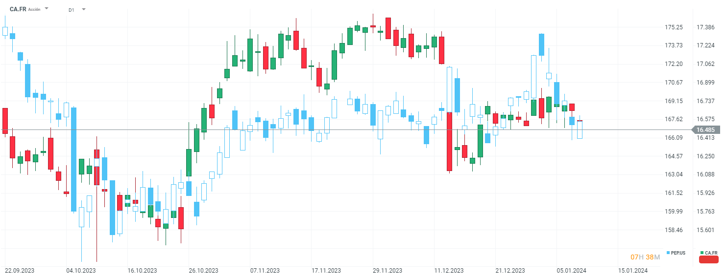 Gráfico diario. Las velas verdes y rojas representan el precio de las acciones de Carrefour, mientras que las blancas y azules las de Pepsi. Fuente: xStation5
