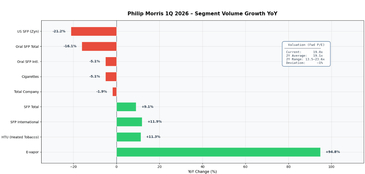 Philip Morris (PM.US) presentó ayer unos resultados muy sólidos correspondientes al primer trimestre de 2026, superando ampliamente las expectativas del mercado. El principal motor de crecimiento sigue siendo el segmento internacional de productos libres de humo (principalmente IQOS), que registró un crecimiento orgánico de ingresos del 15,8% con un aumento de volumen del 11,9%. Este segmento ya representa el 43% de los ingresos totales de la compañía, acercándola a su objetivo de generar más de dos tercios de las ventas a partir de productos libres de humo para 2030.