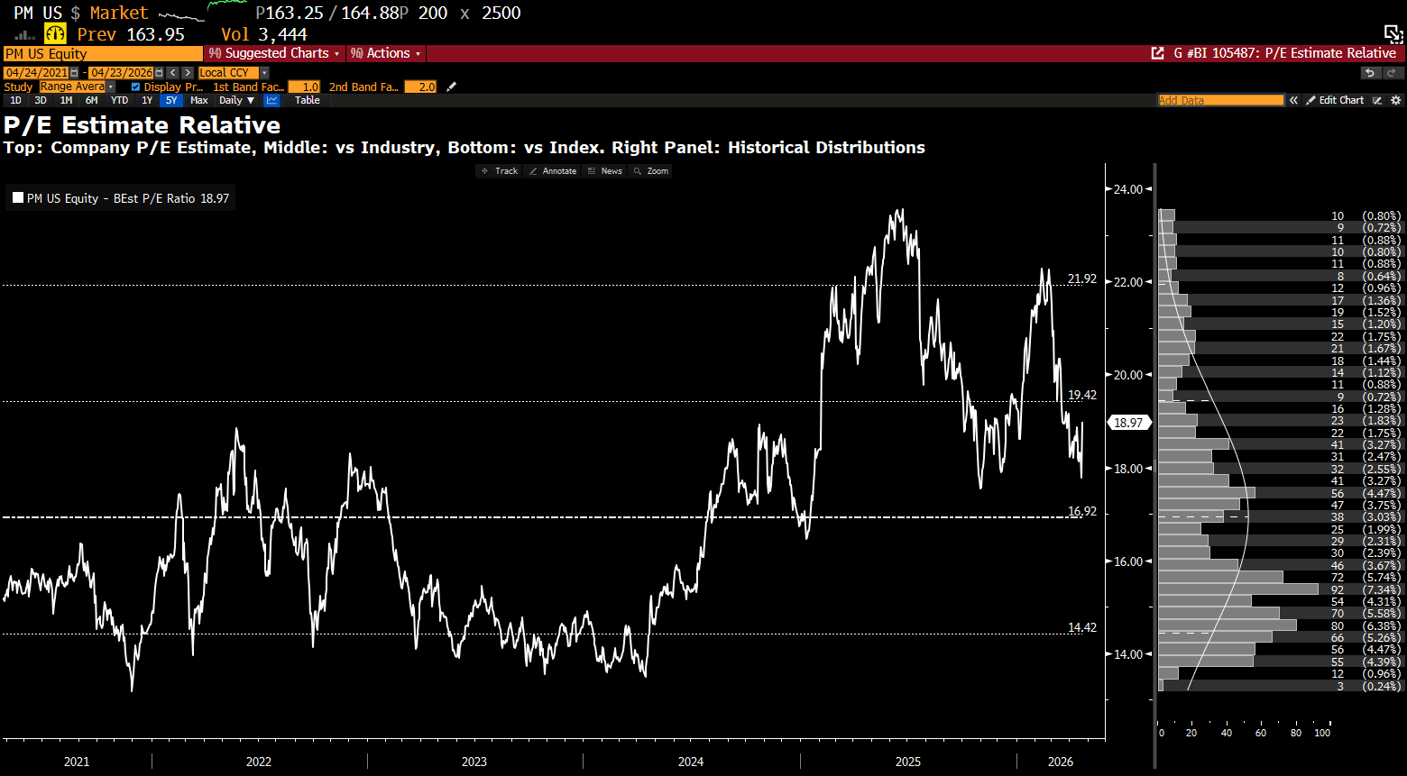Las acciones de Philip Morris cotizan a un PER adelantado de ~19,0x, prácticamente igual al promedio de los últimos dos años (19,1x), con una desviación mínima del -1%. De forma similar:
