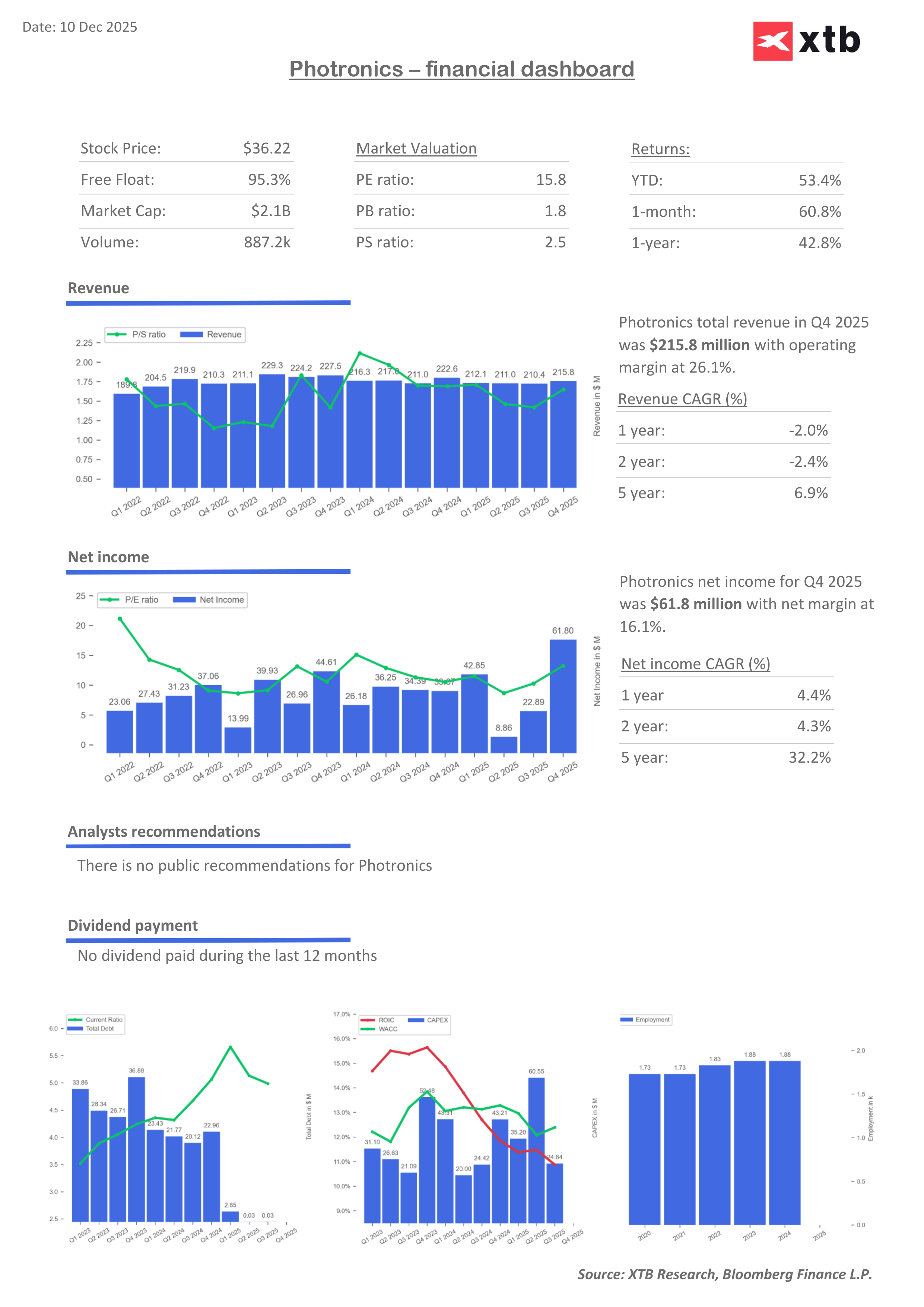 La valoración de Photronics, incluso después del fuerte repunte bursátil de hoy, sigue siendo potencialmente atractiva, con un ratio P/E en los 20 medios y un ratio precio/ventas de 2,5.