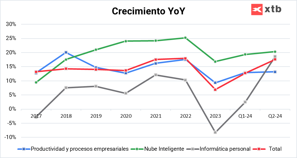 El primero de ellos, es un crecimiento menor al esperado por parte de Windows, tanto a nivel personal como de empresa. En concreto, se esperaba un crecimiento del 7,67% y del 9,97% en su línea de empresa y en la personal respectivamente, mientras que el crecimiento real ha sido del 7% y del 9%. No es una gran desviación, pero sí que refleja la debilidad en el sector del hardware, que influye directamente en la adquisición de licencias. Sin embargo, es probable que veamos un giro en esta tendencia en la segunda mitad del año y se vuelva a tener una mayor actividad sobre todo a nivel empresarial, de confirmarse un aterrizaje suave de la economía americana.