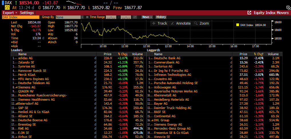 La sesión del miércoles sobre los índices bursátiles europeos trae consigo caídas relativamente importantes. El DAX cede un 0,9%. La situación es mucho peor en el CAC40, que se deja un 1,15%. El repunte dinámico de los rendimientos estadounidenses, impulsado por la postura dura de los banqueros de la Reserva Federal, está arruinando la confianza en Europa. Por el momento, la atención de los inversores se centra en la lectura del IPC de Alemania, que se publicará a las 14:00.