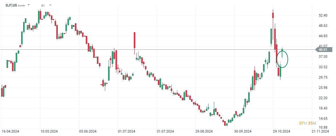 Otros indicadores de que los inversores están esperando la victoria de Donald Trump son precisamente las acciones de su empresa de comunicación, Trump Media, que suben un 17% en lo que llevamos de sesión. Esto nos hace pensar que si finalmente consigue Trump la victoria, sus acciones pueden comenzar un fuerte recorrido al alza, basado en la especulación del mercado.