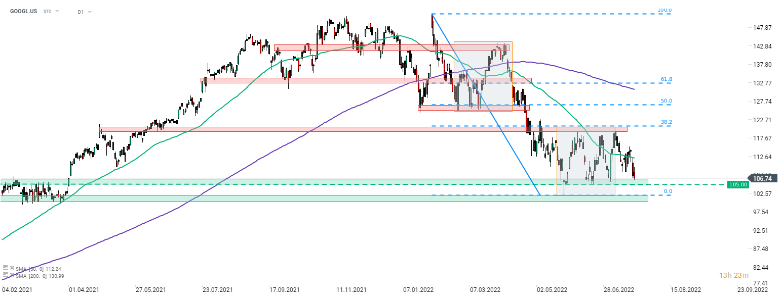 Alphabet (GOOGL.US) ha tenido un rendimiento inferior durante la semana pasada tras una división de acciones de 20 por 1. Sin embargo, mirando desde una perspectiva un poco más amplia, podemos ver que la acción se ha estado negociando lateralmente durante los últimos 2 meses. Los movimientos alcistas están limitados por la zona de resistencia que se encuentra por debajo del retroceso del 38,2 % de la corrección reciente, que además se ve reforzada por el límite superior de la geometría del mercado. La zona de soporte que supera los $105 por acción limita los movimientos a la baja. Las acciones se cotizan actualmente cerca del límite inferior del rango y tienden a ser volátiles después de las publicaciones de resultados, es posible que se avecine una ruptura.