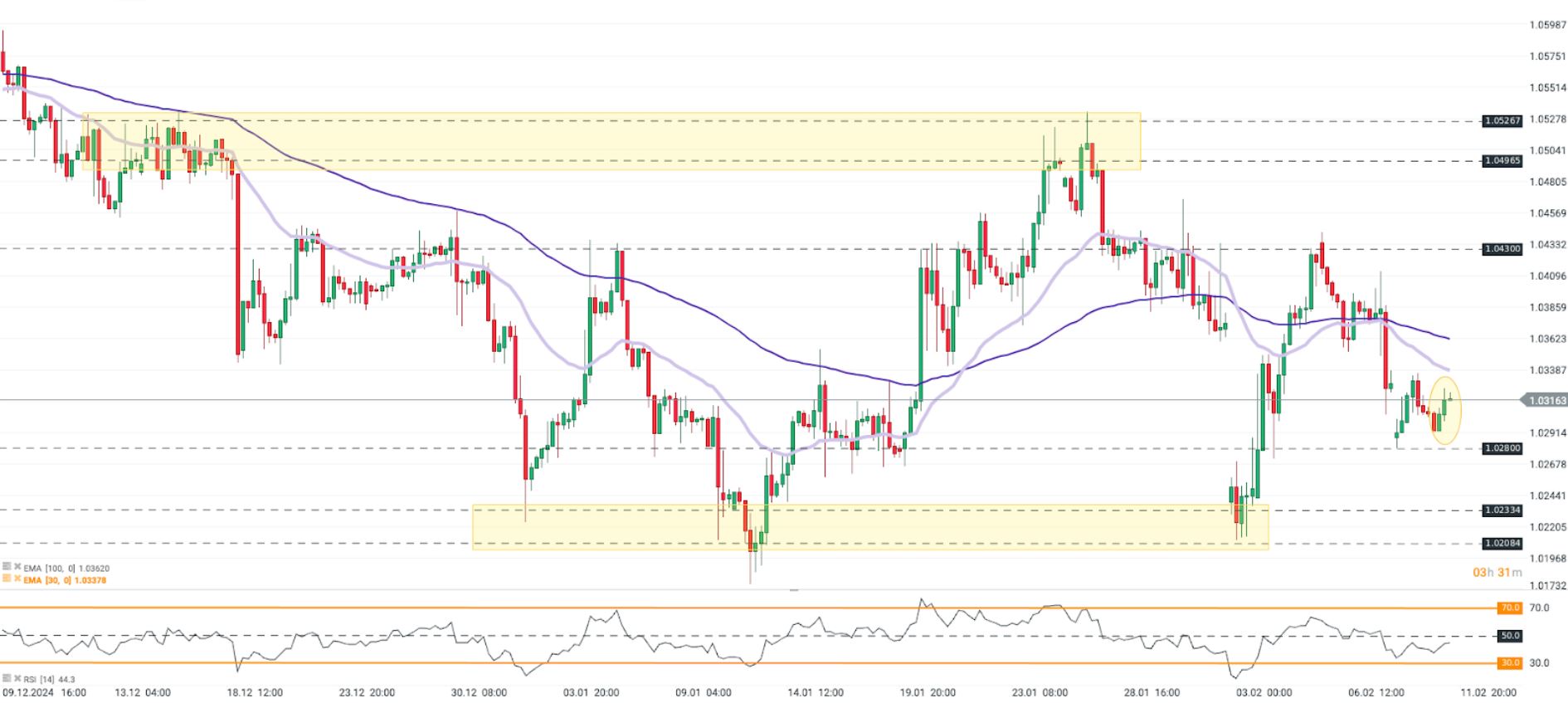 El par EURUSD se recupera un 0,25% desde su mínimo tras el anuncio de los aranceles al acero y al aluminio. Un plan de represalia preciso de la UE podría impulsar al par de divisas hacia la EMA de 30 períodos (violeta claro). Sin embargo, la volatilidad de hoy dependerá principalmente del discurso del presidente de la Fed, Jerome Powell. Fuente: xStation5
