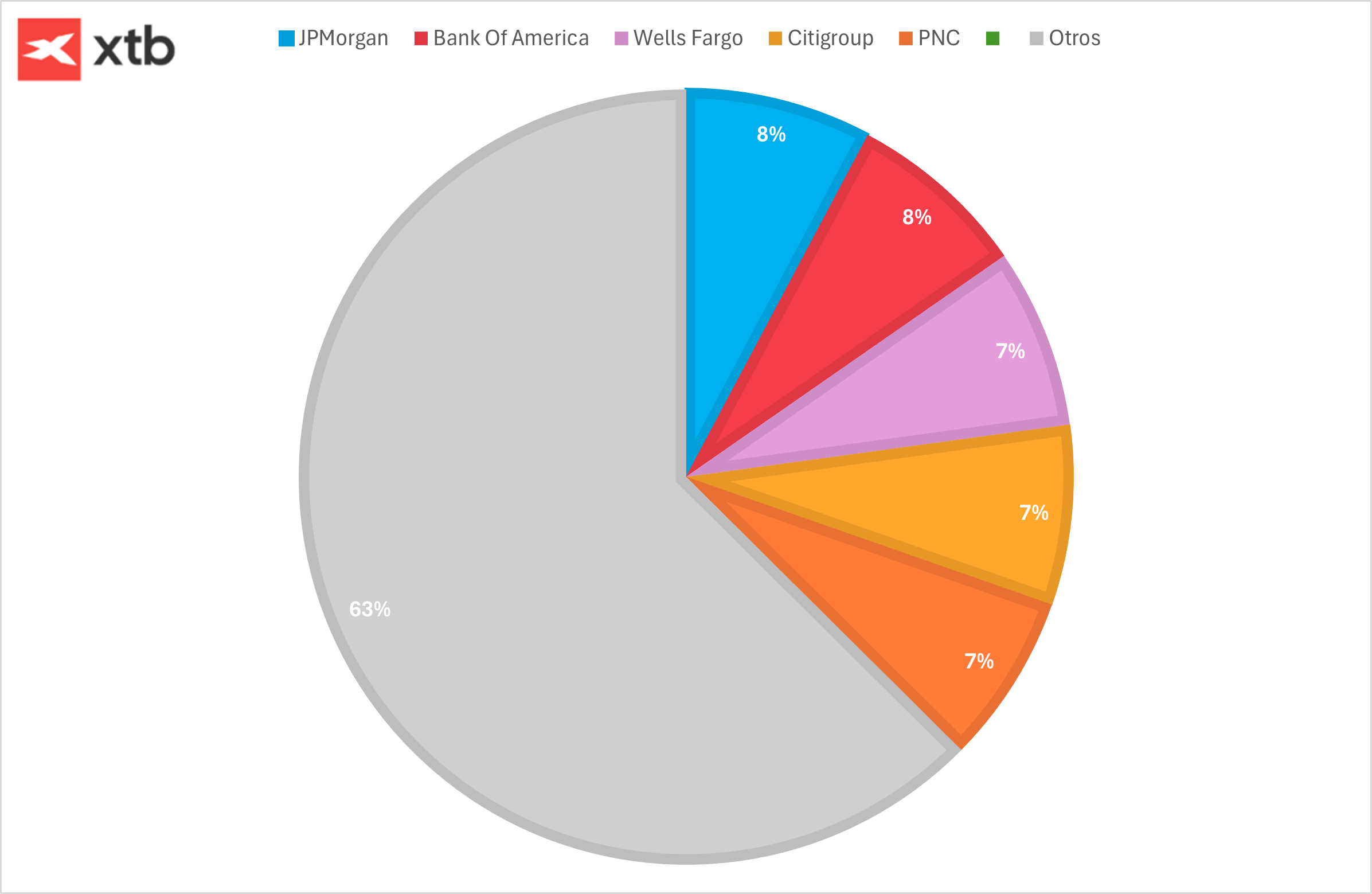 • Entorno favorable por la desregulación: La relajación prevista de las normas de capital podría liberar hasta 2,6 billones de dólares en capacidad de préstamo, fortaleciendo a los grandes bancos, favoreciendo la inversión en inteligencia artificial y centros de datos, y permitiendo mayores retornos al accionista mediante dividendos y recompras de acciones.