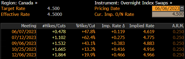Los mercados actualmente están considerando una probabilidad cercana al 48% de que el Banco de Canadá anuncie un aumento de 25 puntos básicos en los tipos de interés mañana. Fuente: Bloomberg.