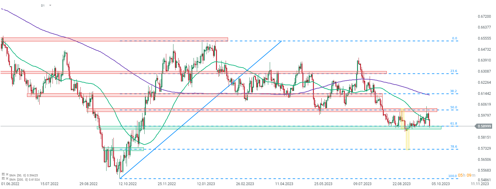 Si observamos el gráfico del NZD/USD en el intervalo D1, podemos ver que el par intentó recientemente superar la zona de resistencia marcada con un retroceso del 50% del movimiento alcista iniciado en octubre de 2022, pero fracasó. Un fuerte retroceso esta semana empujó al par hacia la zona de soporte marcada con un retroceso del 61,8% que actúa como el límite inferior del rango de negociación reciente.