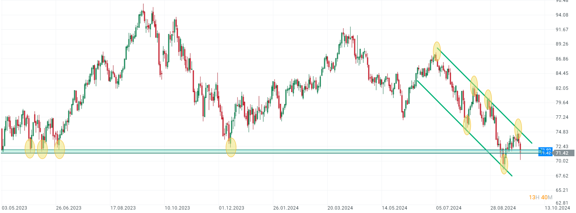 Podemos observar que actualmente está cotizando en un nivel de soporte clave en el rango de los 70-72 dólares barril con el que en anteriores ocasiones durante 2023 ha rebotado posteriormente al alza. Sin embargo, en las últimas semanas podemos dibujar una tendencia bajista de mínimos y máximos decrecientes que podría empujar a la parte baja su cotización incluso por debajo de los 67 dólares lo cual implicaría una espiral bajista más pronunciada en el medio plazo.