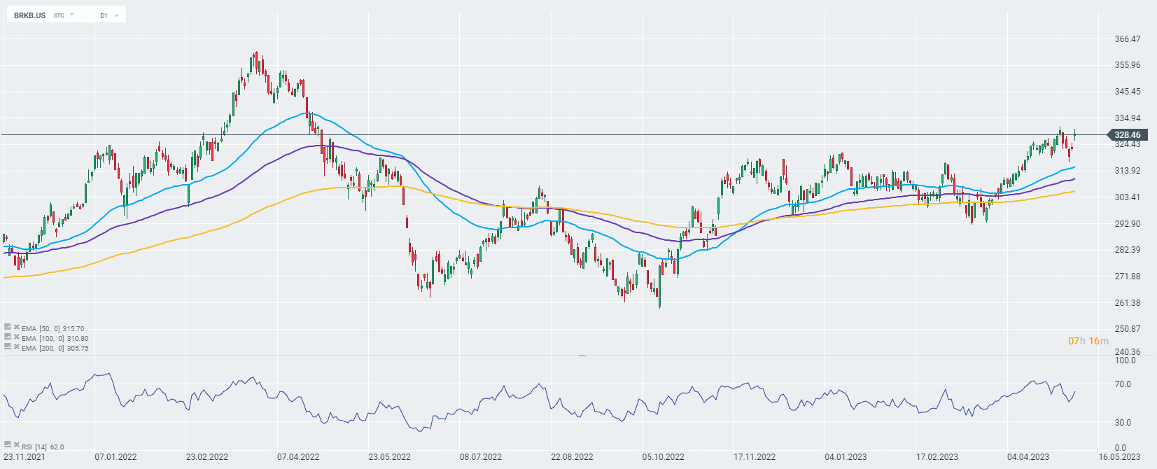 Gráfico de las acciones Clase B de Berkshire Hathaway (BRKB.US). La acción está ganando durante la sesión de hoy gracias a los resultados del holding. Fuente: xStation 5