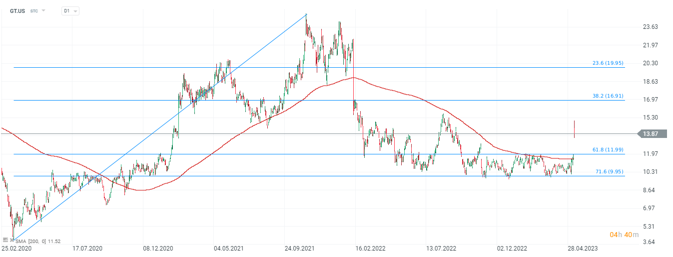 Las acciones de Goodyear (GT.US) abrieron hoy con una gran brecha alcista, con el precio superando una resistencia clave en forma de la SMA de 200 (línea roja), en el intervalo D1. Fuente: xStation5.
