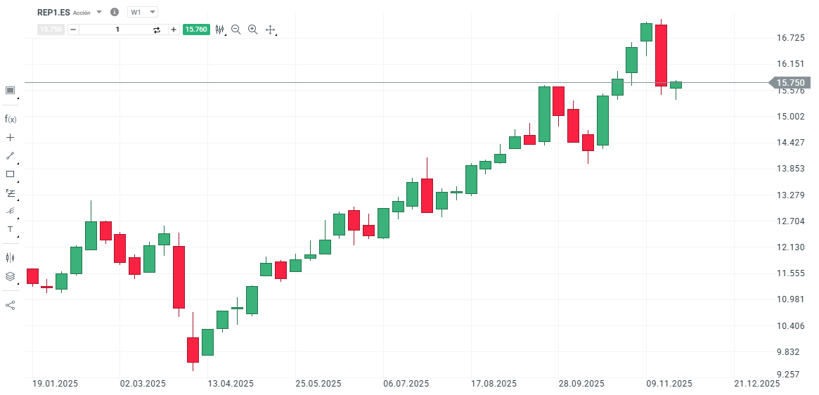 Las acciones de Repsol suben un 0,55% en la sesión, mientras que en el acumulado del año la petroquímica repunta un 32%.