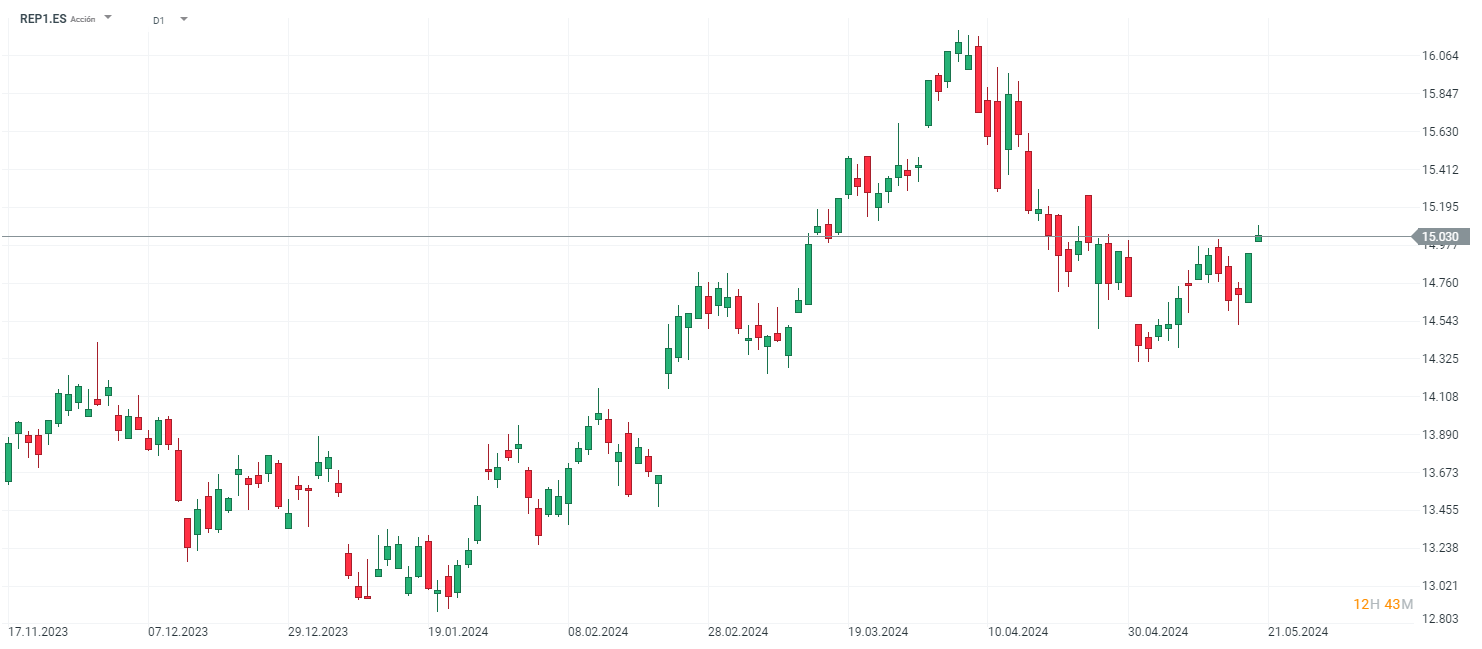 Las acciones de Repsol suben un 10% en lo que va de año y en concreto hoy suben por la incertidumbre geopolítica. Tras la muerte del presidente de Irán en un accidente de helicóptero, algunos inversores anticipan más incertidumbre en el mercado del petróleo y mayores precios. De momento, el precio del crudo cae ligeramente.