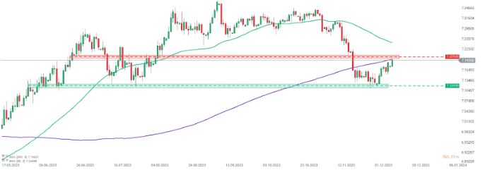 El USDCNH sube a un máximo de 3 semanas después de que los datos de inflación china de noviembre fueran inferiores a lo esperado. El par está probando la zona de resistencia en el área 7.2050, marcada por reacciones de precios anteriores y media móvil de 200 sesiones (línea violeta). Fuente: xStation5