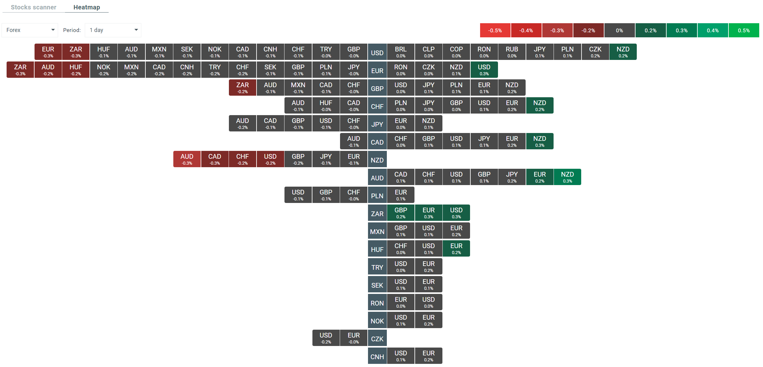 Mapa de calor que muestra la volatilidad actual en el mercado de divisas y pares de divisas específicos. Fuente: xStation 5