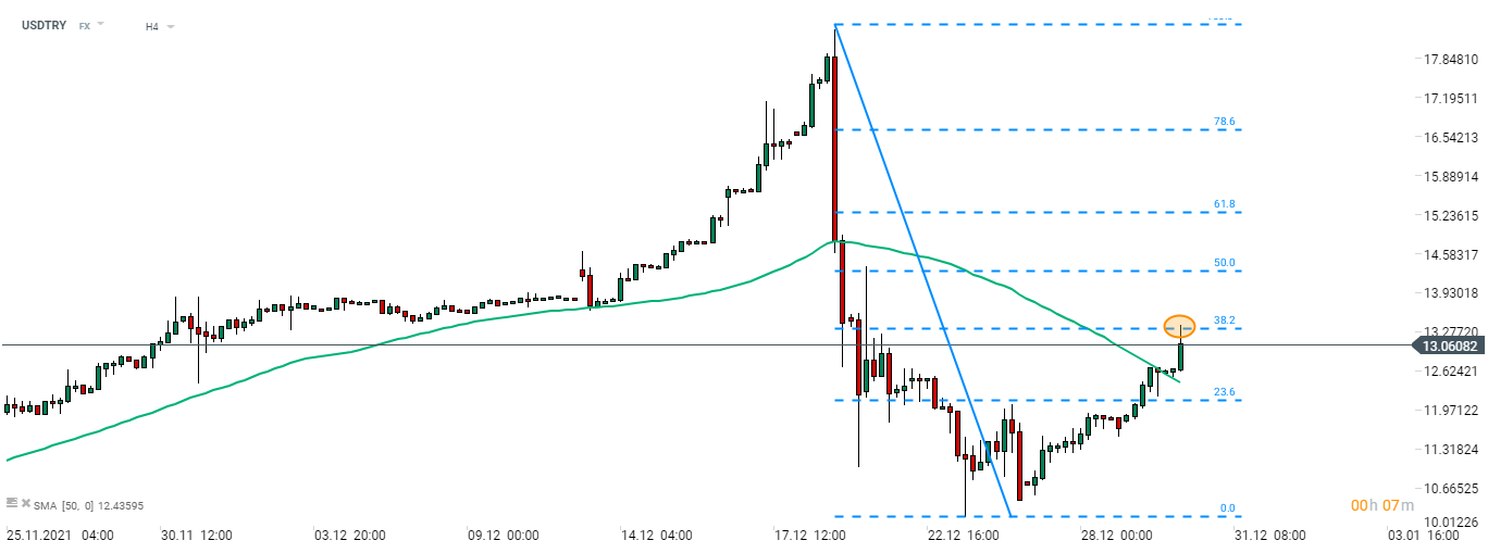 La lira turca es uno de los activos que ha registrado mayor movimiento tras el fin de semana navideño. El par USDTRY ha comenzado a repuntar de nuevo esta semana al abrigo del debilitamiento de ésta, superando ya la frontera de 13.00. No obstante, ese movimiento ha sido frenado en el nivel 38.2% del retroceso de Fibonacci desde el último máximo de la semana anterior. Fuente: xStation5