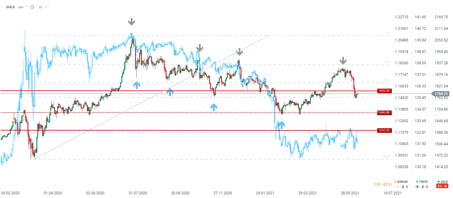El oro se cotiza en una secuencia descendente. Si prevalece el sentimiento actual, entonces el movimiento a la baja podría incluso alcanzar el soporte en 1,600 USD por onza. Por otro lado, también se debe observar el comportamiento de los rendimientos de los bonos. Recientemente, los vendedores intentaron romper por debajo del 1,4%. El futuro destino del oro dependerá del dólar y los rendimientos de los bonos, aunque actualmente en menor medida. Fuente: xStation5