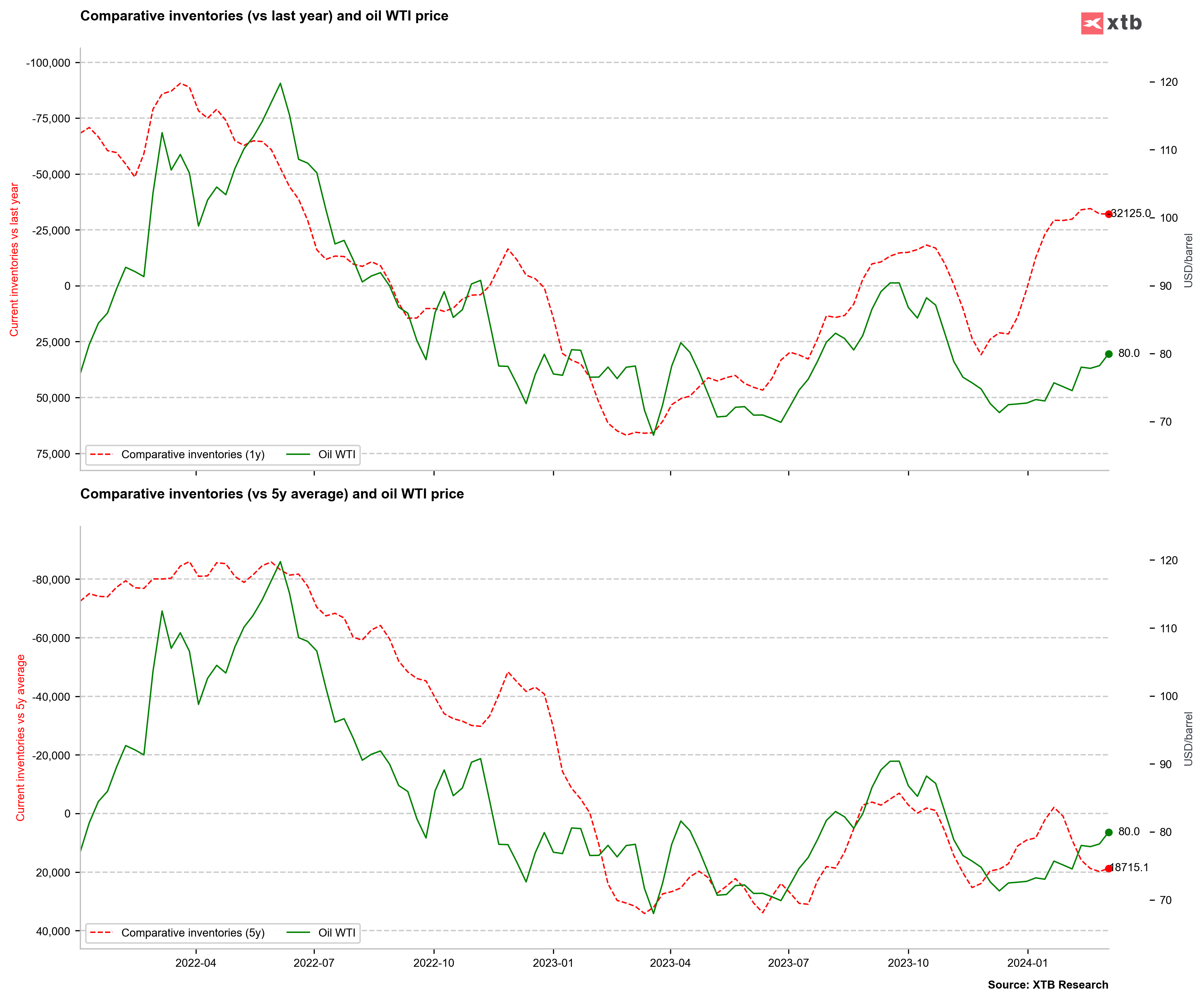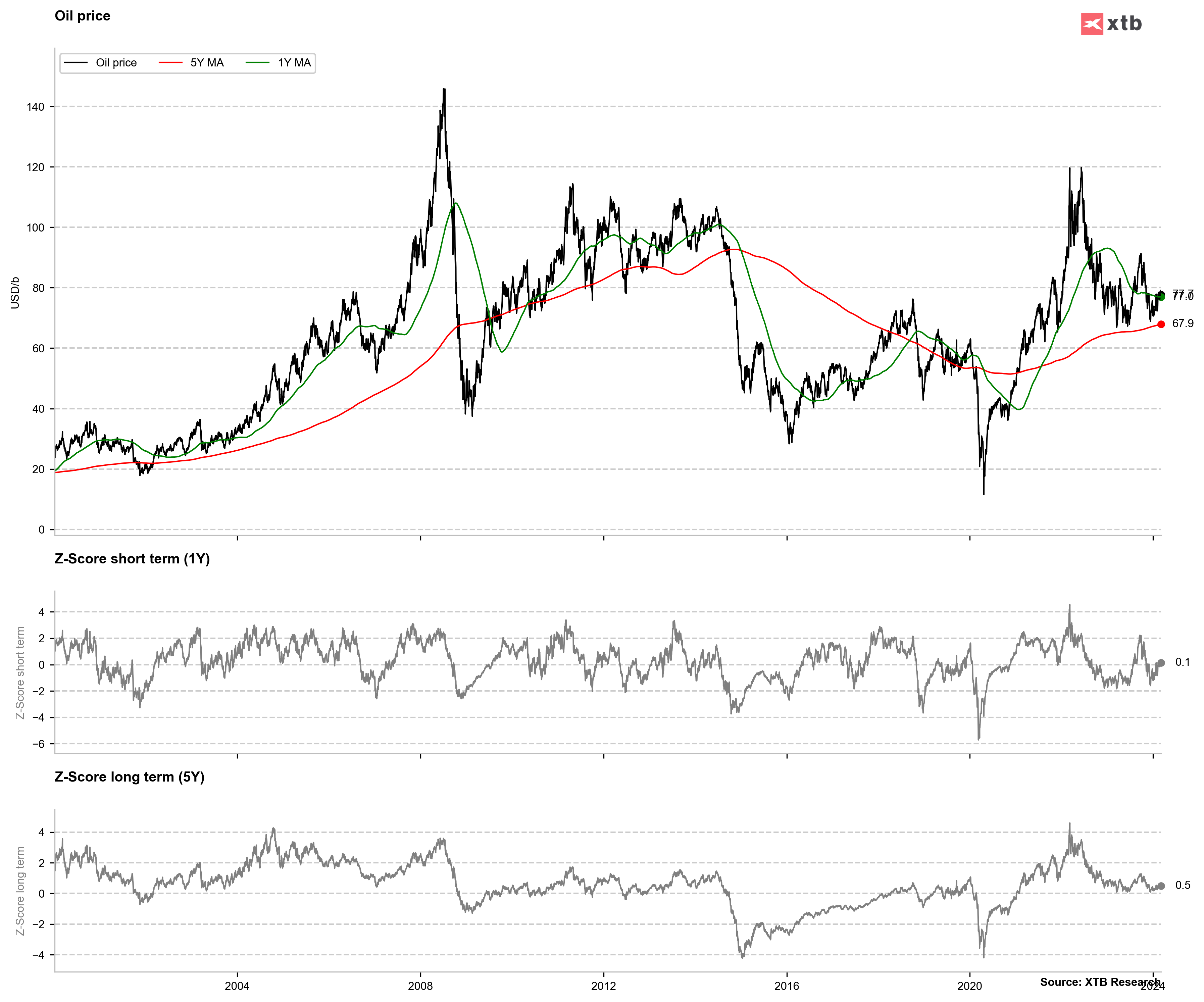 El precio del WTI está en línea con el promedio móvil de 1 año y alrededor de media desviación estándar por encima del promedio de 5 años. Fuente: Bloomberg Finance LP, XTB Researc