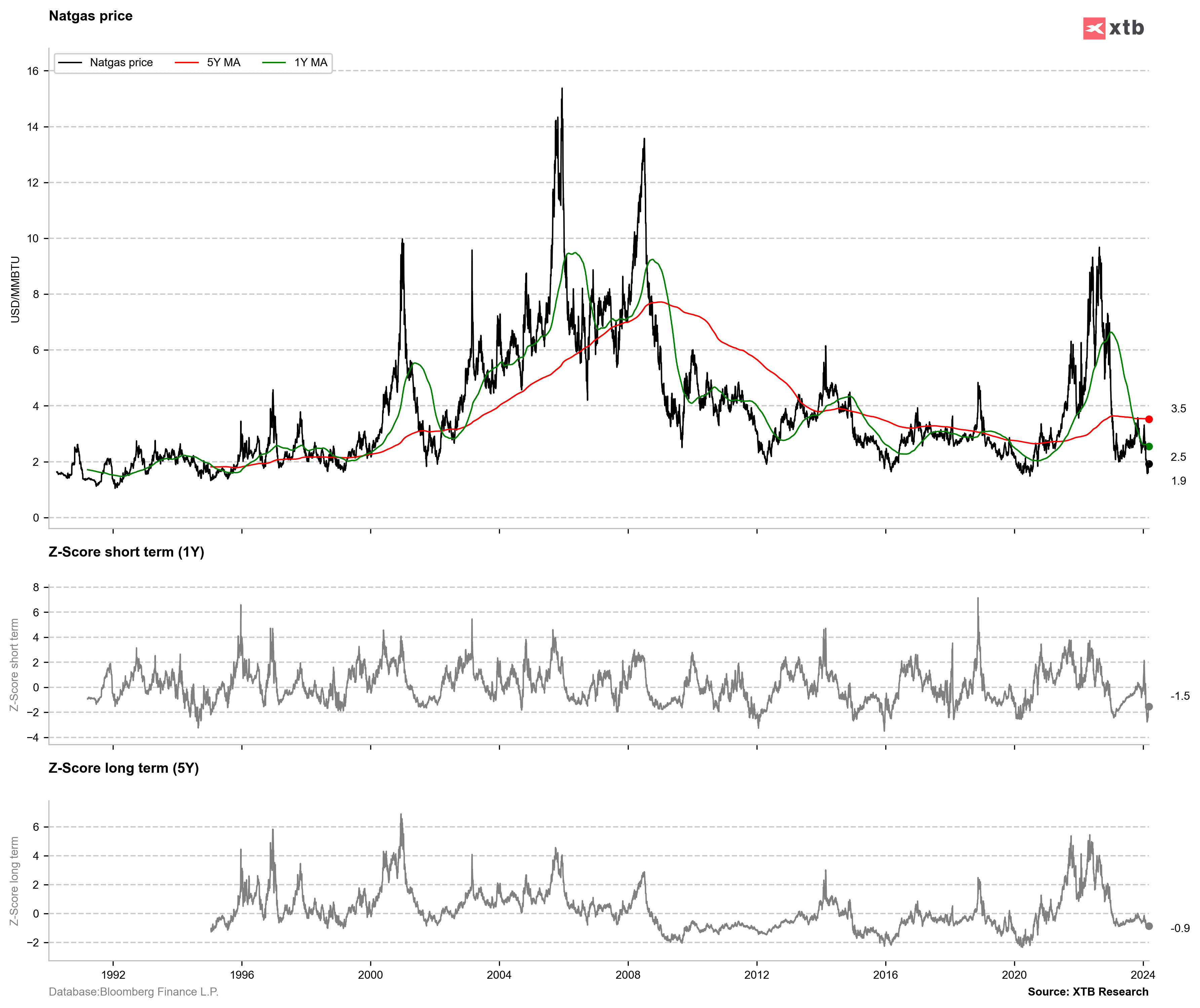 Los precios del gas natural estadounidense se están recuperando después de caer más de 2 desviaciones estándar por debajo de la media de un año. Fuente: Bloomberg Finance LP, XTB Research