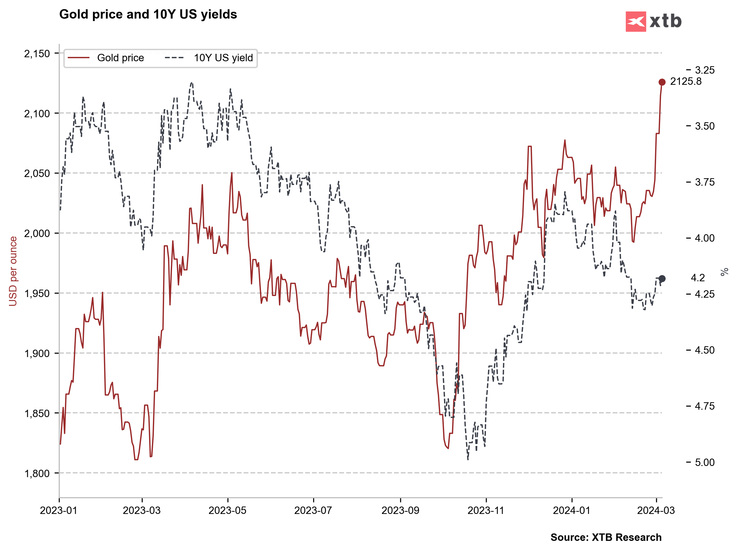 Si bien el reciente aumento del oro estuvo acompañado por una caída de los rendimientos, la magnitud del movimiento en el mercado de bonos no justificó un aumento a nuevos máximos históricos. Fuente: Bloomberg Finance LP, XTB Research