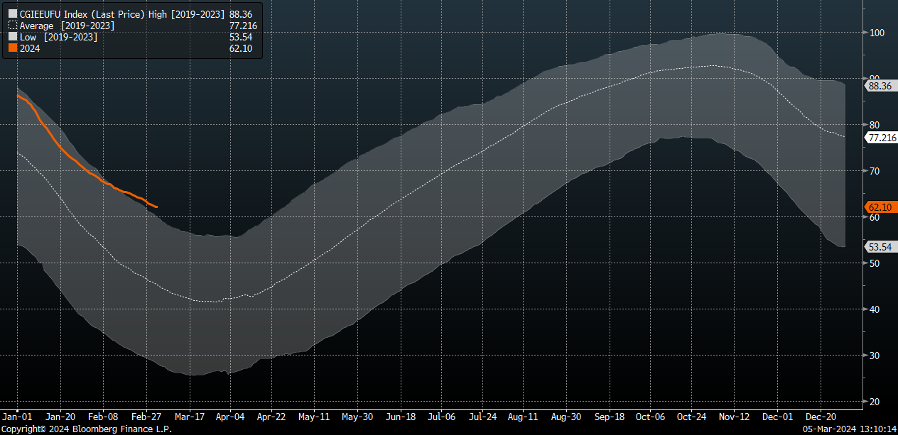 - El retroceso continuo está en línea con la estacionalidad. Se debería alcanzar un mínimo local en la segunda quincena de marzo, seguido de una recuperación de precios de aproximadamente dos meses de duración.
