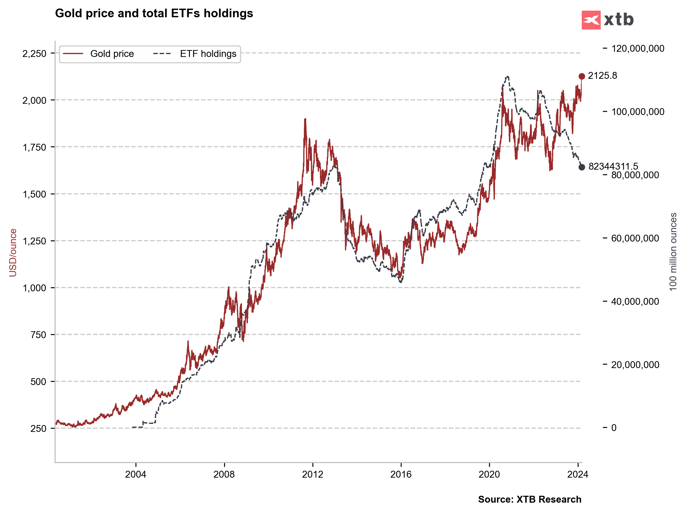 Los ETF siguen siendo vendedores netos de oro y sus tenencias caen al nivel más bajo desde principios de 2020. Fuente: Bloomberg Finance LP, XTB Research