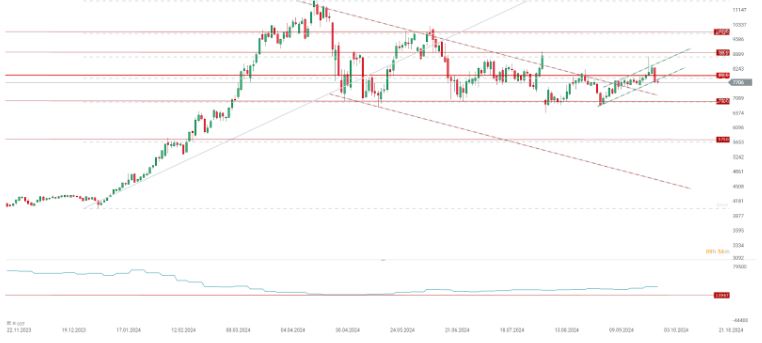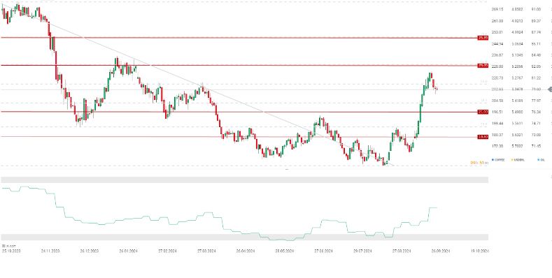 El precio del cacao se mantiene en niveles relativamente altos. Vale la pena recordar que tendremos un rollover de futuros en noviembre. Antes de los rollovers anteriores, había una clara presión alcista sobre los precios. Fuente: xStation5