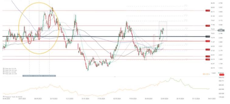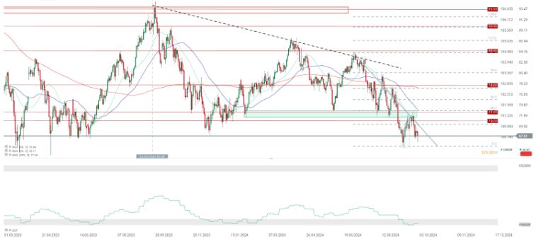 El crudo WTI lleva varias semanas consolidándose. Cabe señalar que, debido al huracán en Estados Unidos, es posible que haya habido una caída reciente en la demanda de combustible. Fuente: Bloomberg Finance LP, XTB