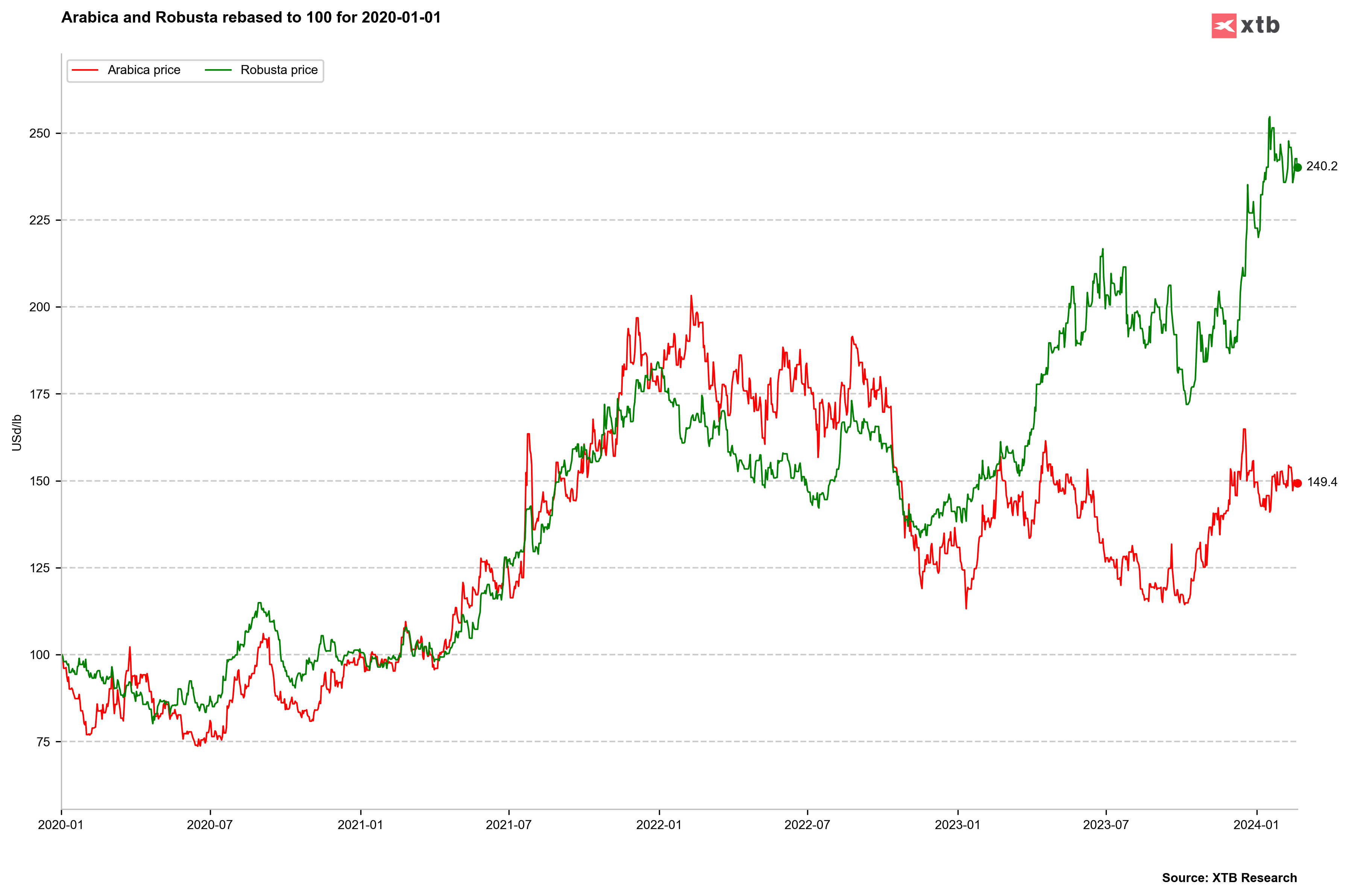 El precio del Robusta ha bajado ligeramente últimamente, mientras que el precio del Arábica se ha estabilizado. Es importante enfatizar que el gráfico de precios está fijado en 100 para el 1 de enero de 2020. Fuente: Bloomberg Finance LP, XTB Research