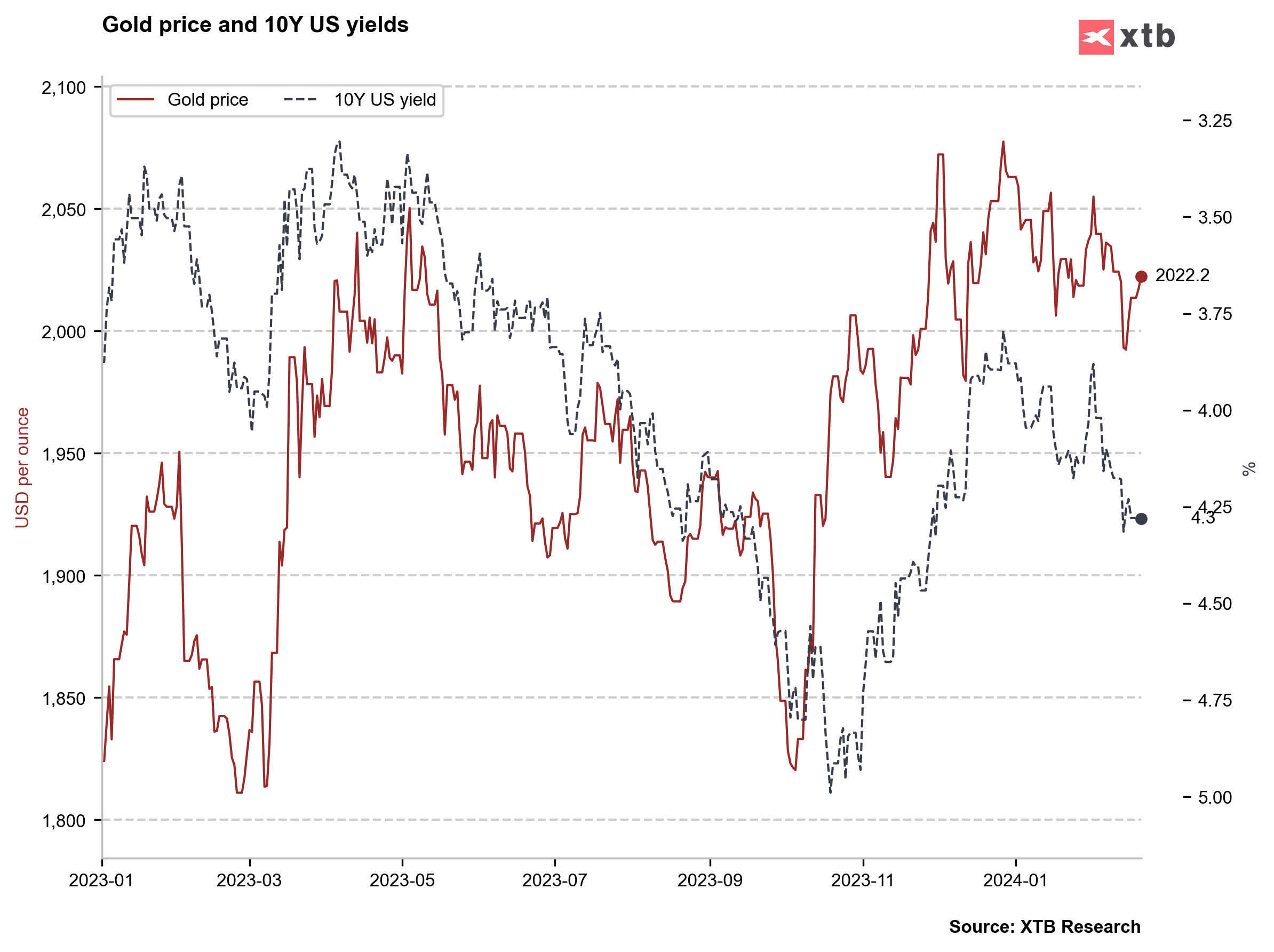 El oro parece estar alto cuando se analizan los rendimientos. Si los próximos datos de EE.UU. decepcionan, los rendimientos deberían volver a alrededor del 4% o menos. Fuente: Bloomberg Finance LP, XTB Research