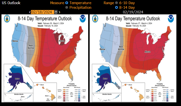 - Se espera que en un futuro próximo el tiempo siga siendo muy bueno, con temperaturas significativamente más altas de lo habitual en casi todos los estados federados. La excepción es la costa oeste, donde se espera que las temperaturas sean más bajas. Sin embargo, las necesidades de calefacción en la costa son menores en comparación con el Medio Oeste y la Costa Este.