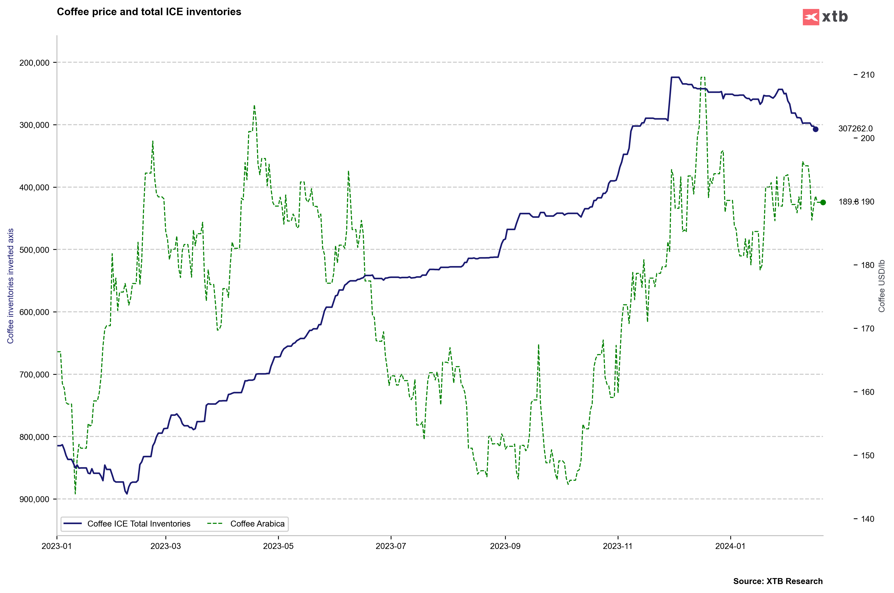 - Las reservas de Robusta en el ICE han caído al nivel más bajo de la historia. Cabe señalar que el aumento de los costes del Robusta también está asociado a la crisis del transporte en el Mar Rojo.
