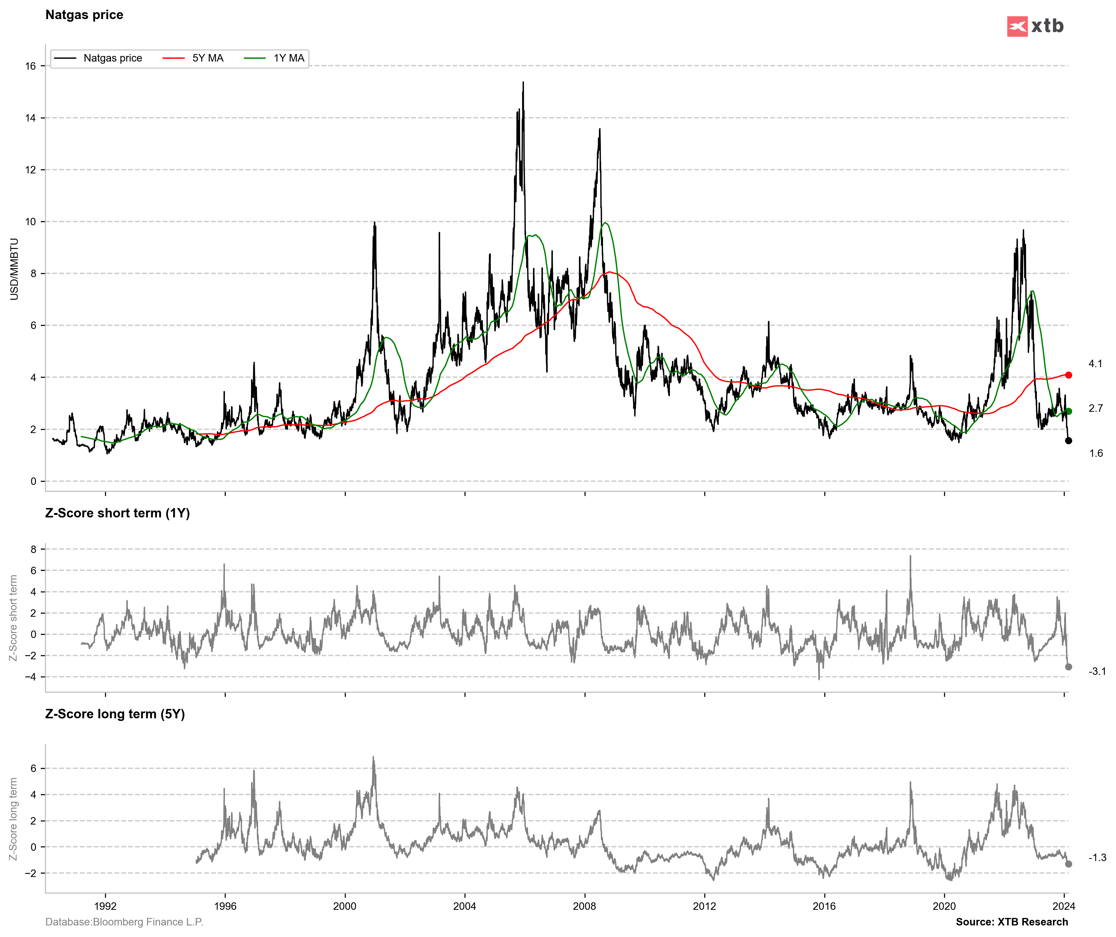 El gas natural está infravalorado si se analiza la desviación con respecto al promedio de 1 año, pero todavía hay margen para la caída si se analiza el promedio de 5 años. Fuente: Bloomberg Finance LP, XTB Research