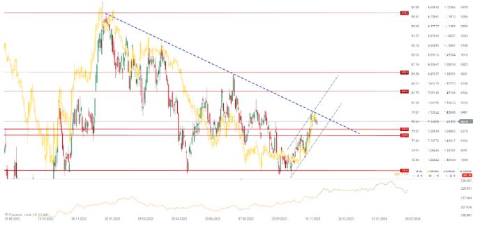 La relación oro-plata cayó significativamente, lo que sugiere que una nueva tendencia puede estar a punto de comenzar. Parece que la relación puede caer a 76,00, lo que con un precio del oro de alrededor de 2.000 dólares por onza se traduce en un precio de la plata por encima de 26,00 dólares por onza. Fuente: Bloomberg Finance LP, XTB