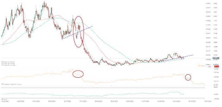 El ORO está intentando mantenerse por encima de los 2.000 dólares la onza. Las subidas actuales están impulsadas por el repunte de los precios de los bonos (caída de los rendimientos) y son similares a las situaciones de octubre de 2018, enero de 2020 y octubre de 2022, a las que siguieron fuertes movimientos alcistas del oro. Fuente: xStation5
